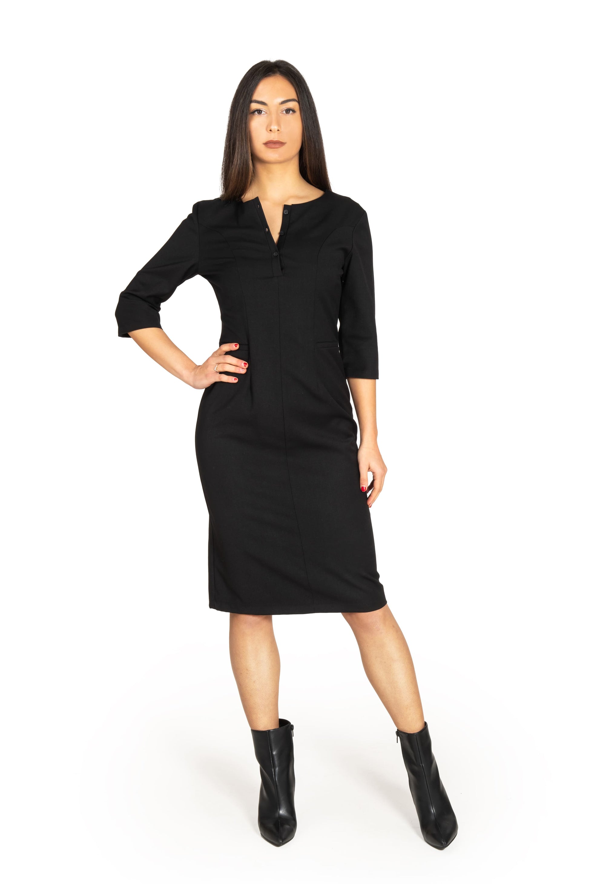 Abito modello tubino con manica 3/4  abbottonatura su centro davanti e tasche a filetto. L'abito è caratterizzato da tagli verticali, leggera svasatura sul fondo e lunghezza al ginocchio. Vestibilità morbida