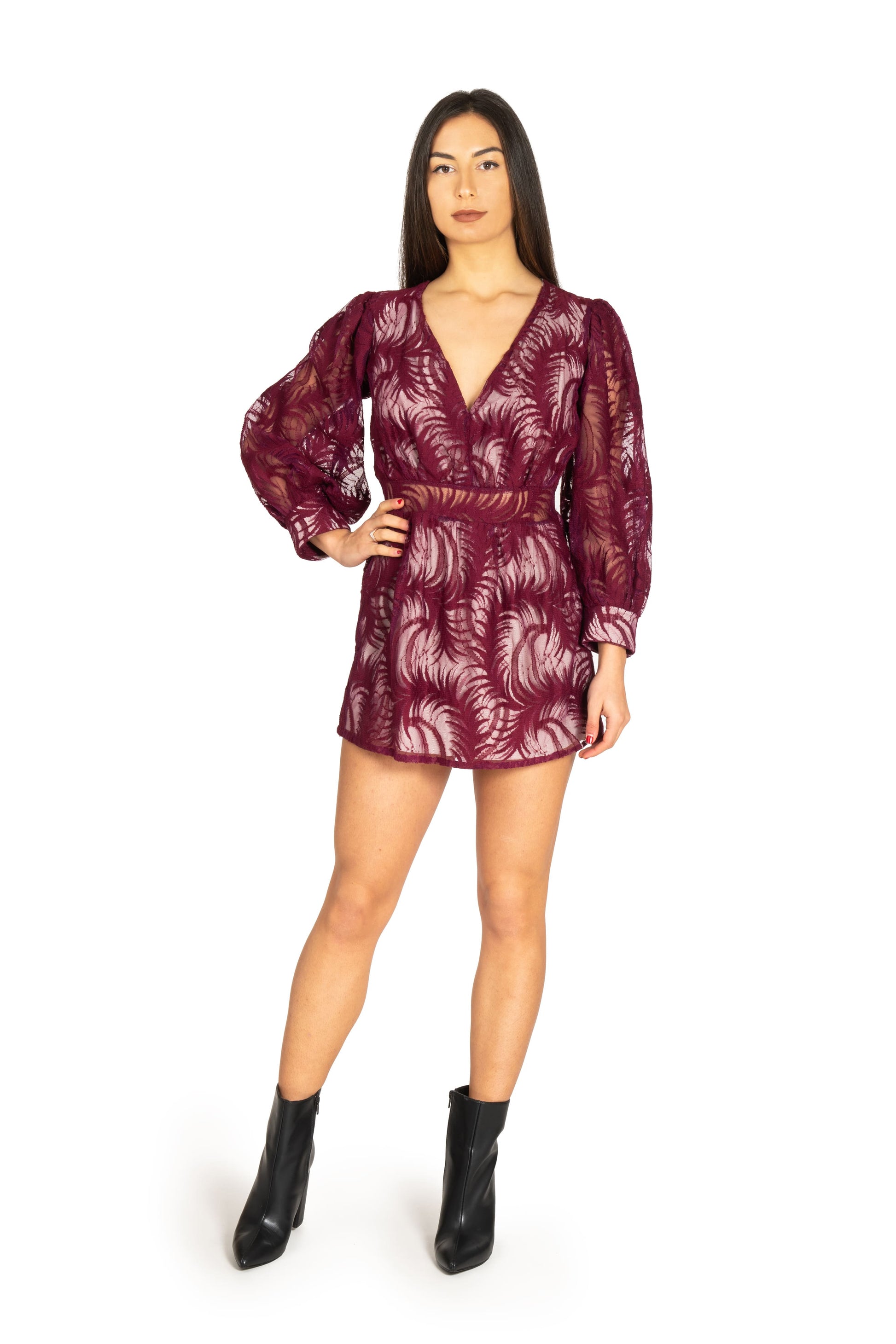 Abito in pizzo foderato con ampia scollatura a V manica molto ampia con polsino sul fondo, giochi di trasparenze su manica e punto vita e gonna leggermente svasata lunghezza mini. Vestibilità morbida