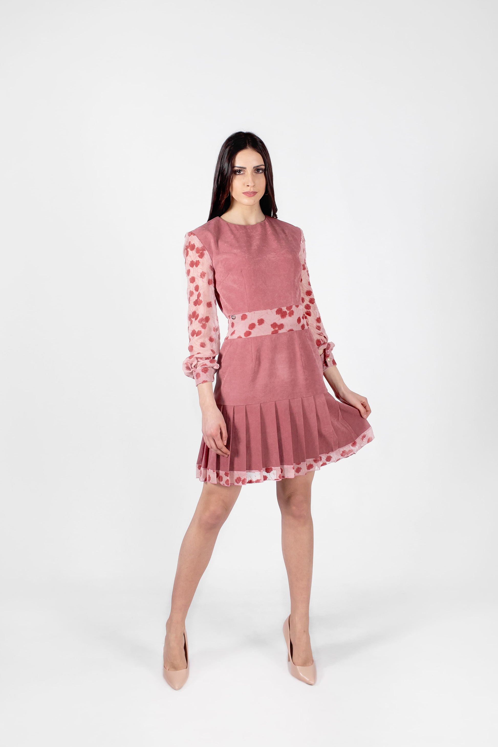 Abito in velluto con inserti di tessuto con motivi in velluto, manica ampia sul fondo e polsino, fascione in vita con inserto e gonna a pieghe lunghezza sopra il ginocchio con inserto sull' orlo. Vestibilità morbida