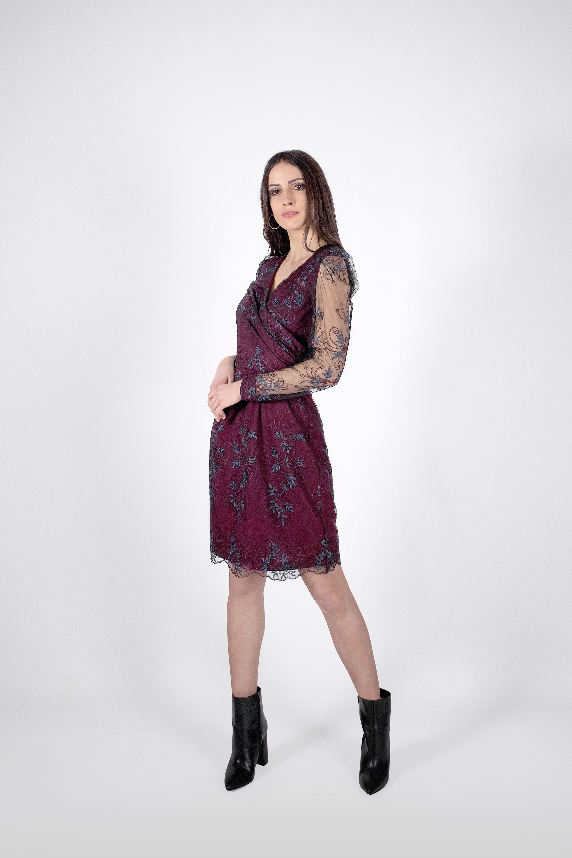 Abito in tulle ricamato foderato, scollo a V e corpetto incrociato e gonna con drappeggio, manica effetto nudo in tulle, lunghezza abito al ginocchio. Vestibilità morbida