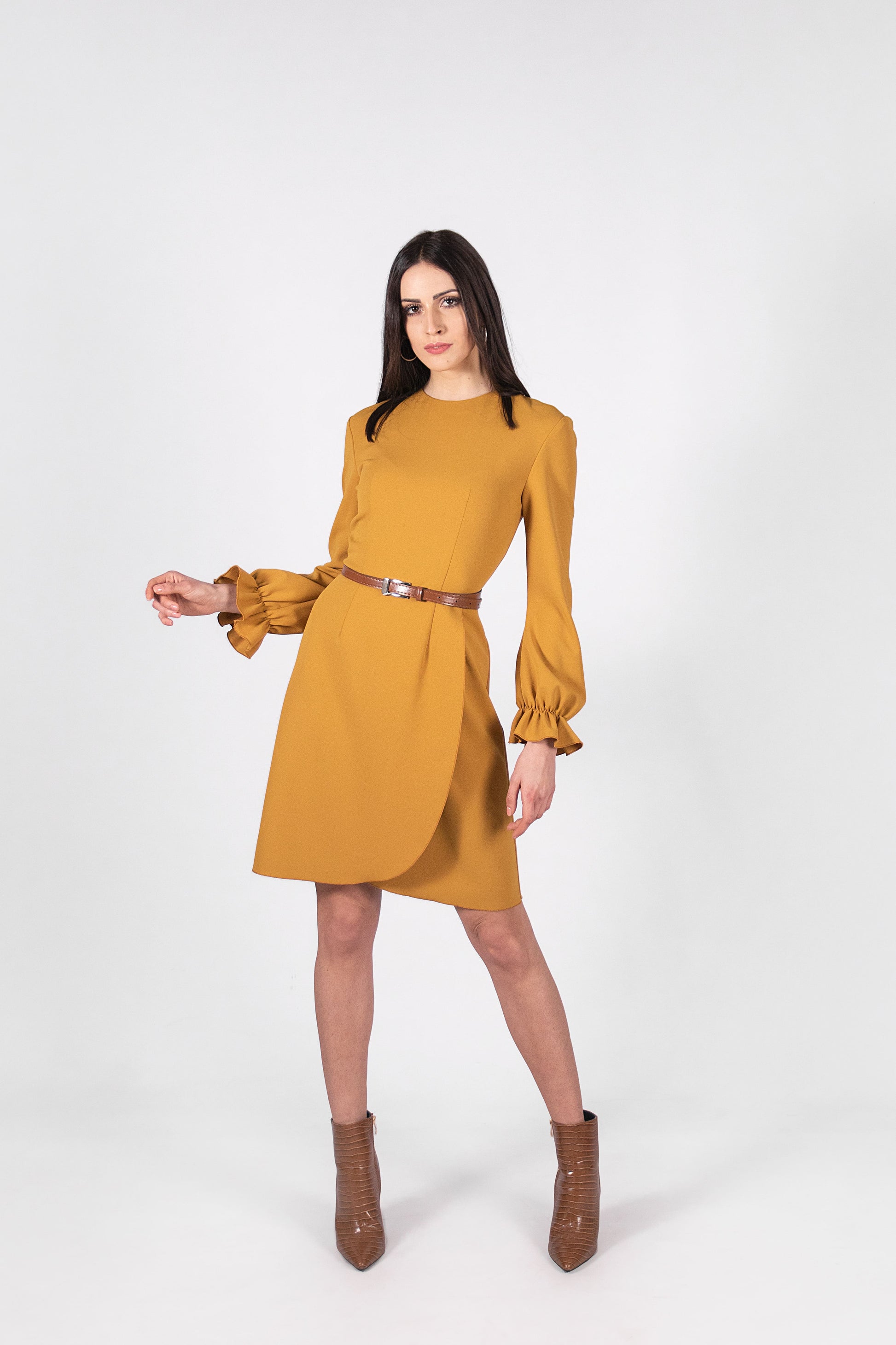 Abito con scollatura girocollo, manica ampia sul fondo con elastico ed arricciatura, taglio in vita e gonna a portafoglio leggermente sopra al ginocchio. Vestibilità morbida