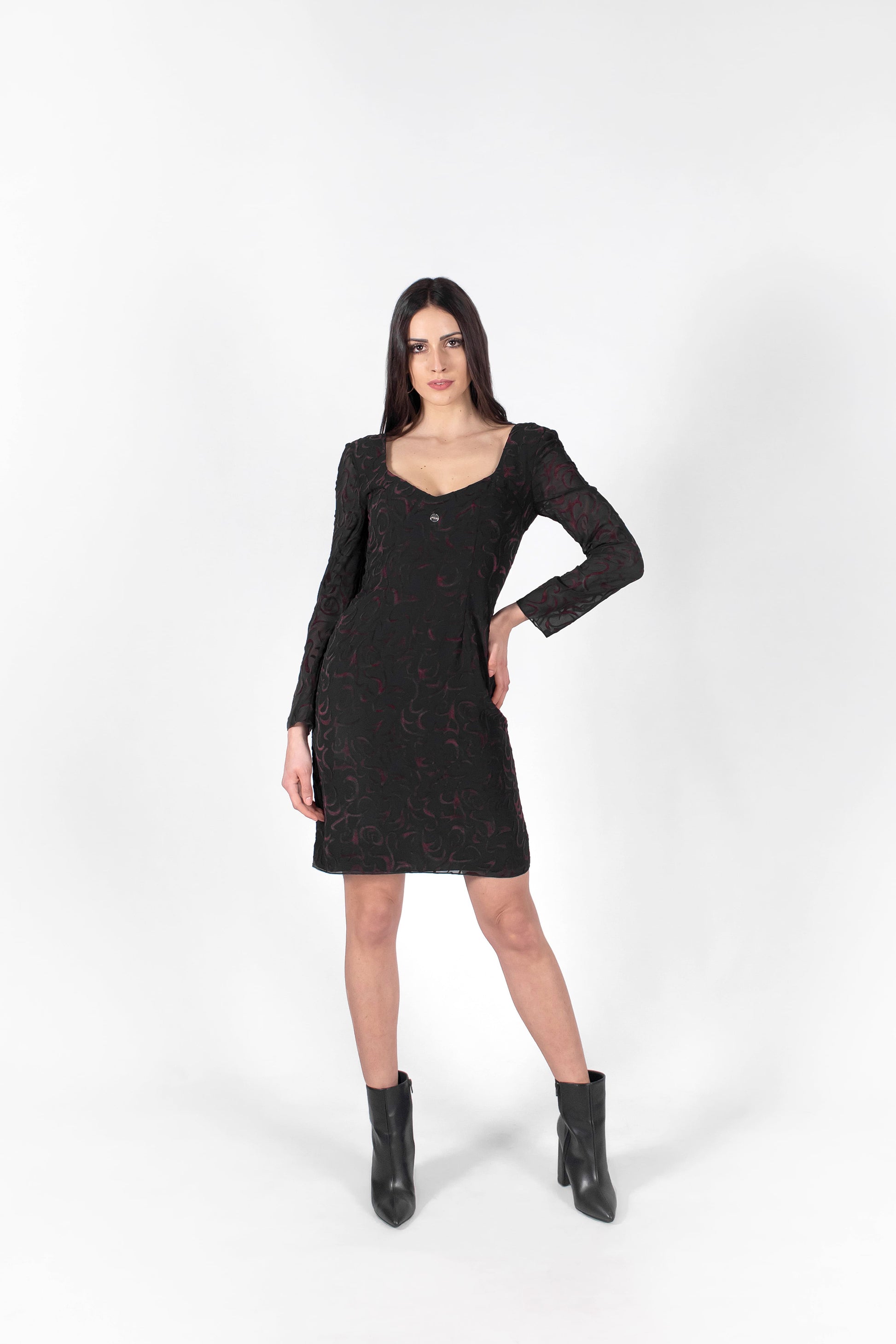 Abito donna in tulle e pizzo di velluto, scollatura ampia, manica lunga e gonna leggermente svasata sul fondo. Lunghezza abito sopra il ginocchio. Vestibilità morbida