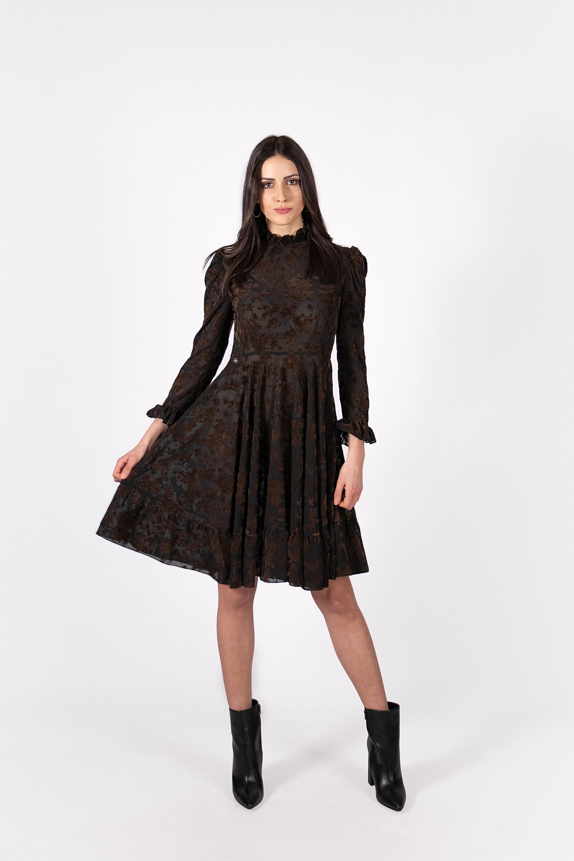 Abito con arricciatura su colmo e fondo manica in tulle e velluto, scollatura arricchita da rouches e gonna fon fondo ampio a  mezza ruota. Vestibilità morbida