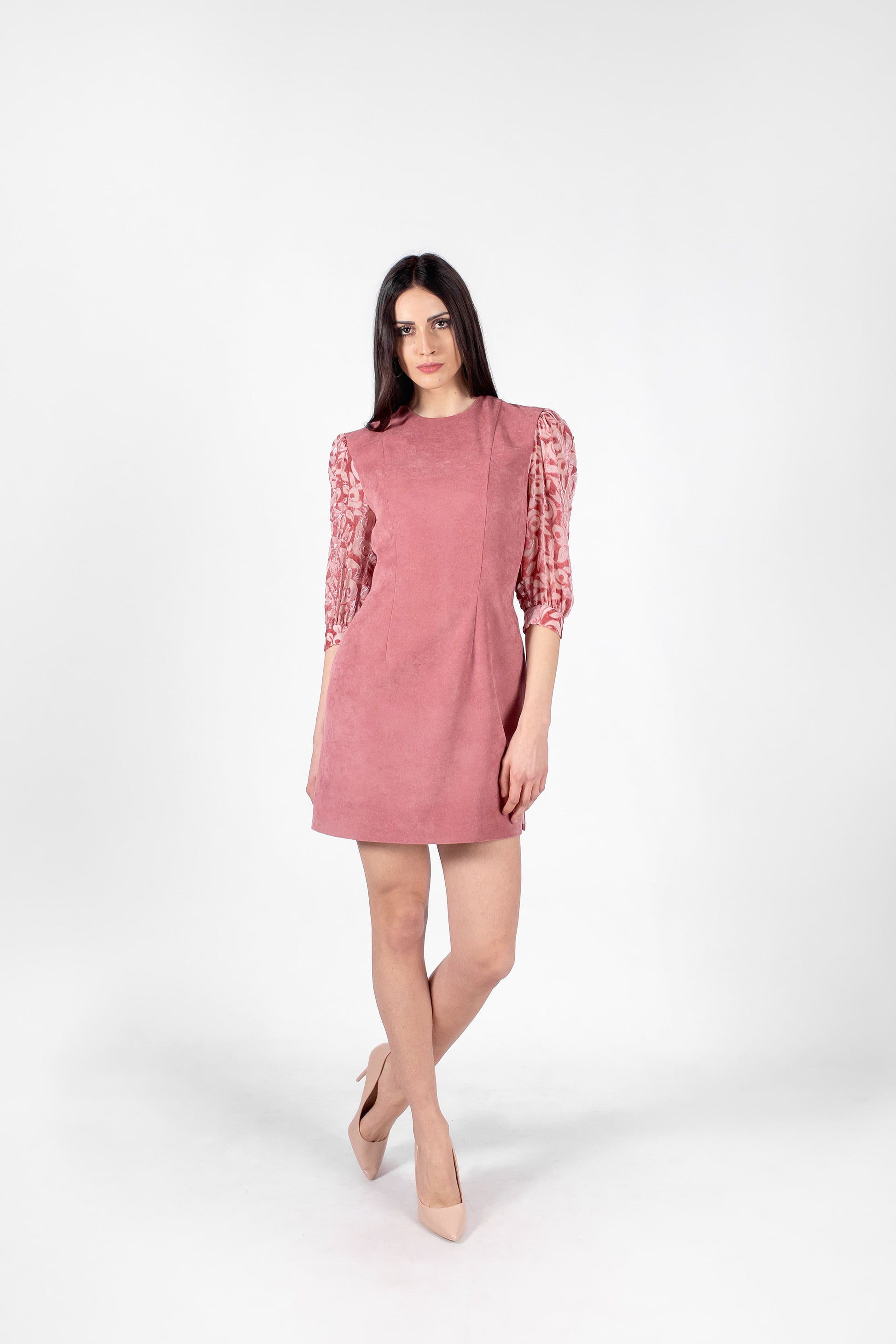 Abito in doppio tessuto, velluto e pizzo di velluto. Manica ampia sul colmo con polsino, lunghezza 3/4. Abito con taglio in vita e gonna leggermente svasata lunghezza sopra il ginocchio. Vestibilità morbida