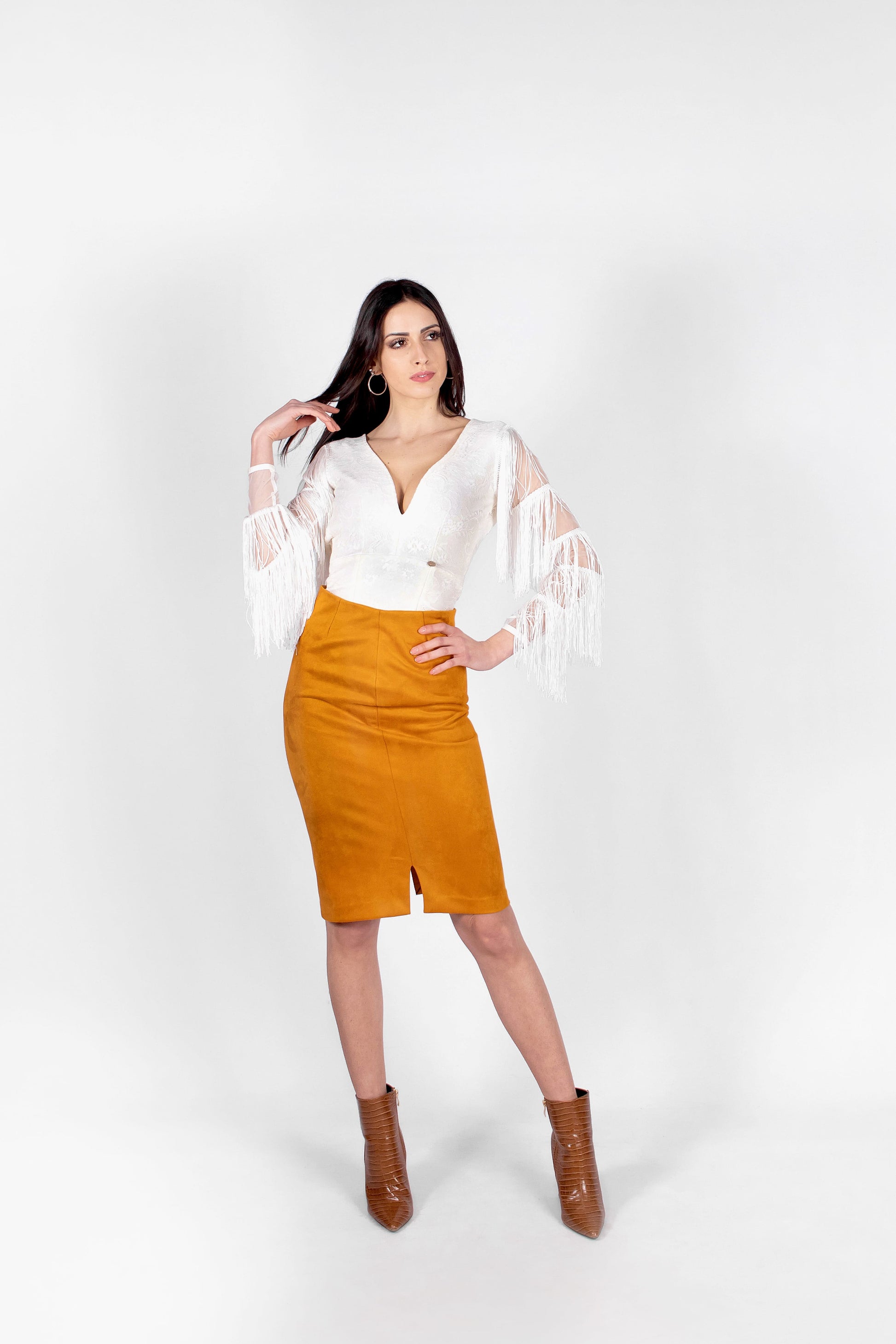 Gonna tubino con spacchi su centro davanti e centro dietro, lunghezza al ginocchio. Vestibilità fasciante