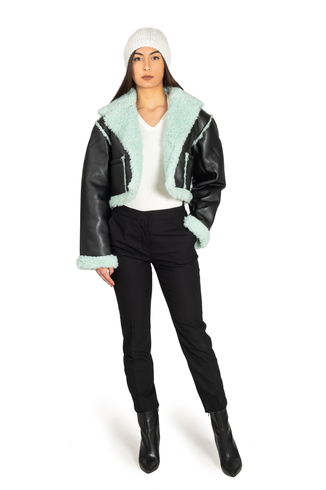 Giacca montone crop in ecopelle bicolore, vestibilità morbida