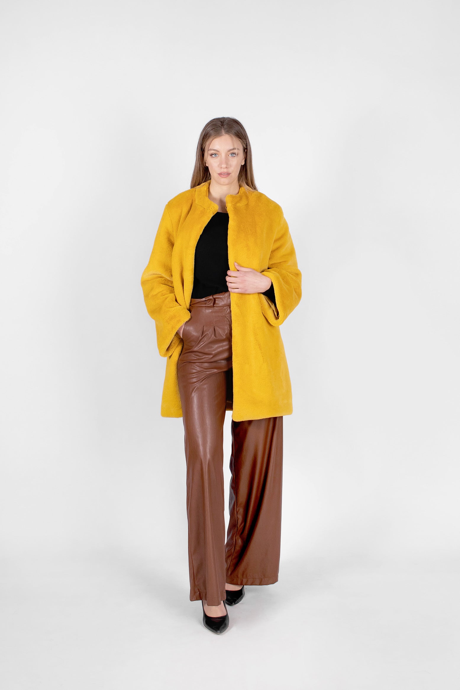 Eco pelliccia lunghezza sopra in ginocchio con chiusura con gancetto sul centro davanti, vestibilità morbida
